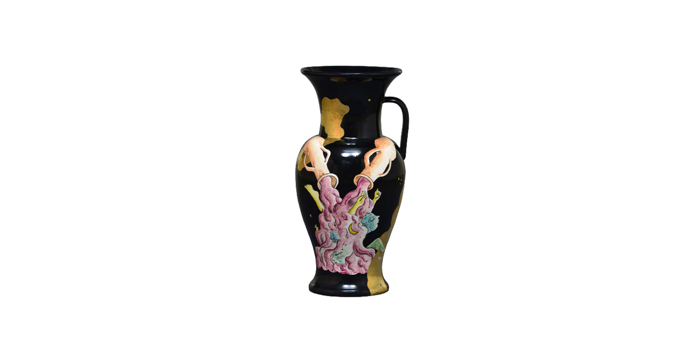 Each amphora features two scenes painted in pastel colours with golden inserts, in which the human figures have physical characteristics inspired by an imagery that links Italian painting, from Simone Martini to Carlo Carrà, to a northern European sensibility more in keeping with artists such as Lucas Cranach and Otto Dix, with faces showing blissful eyes and bodies with flowing shapes. The figures stand out against a black background, both inside and outside the amphorae; in interpretations of oriental mysticism, black is a colour that turns the divine into a blinding darkness.