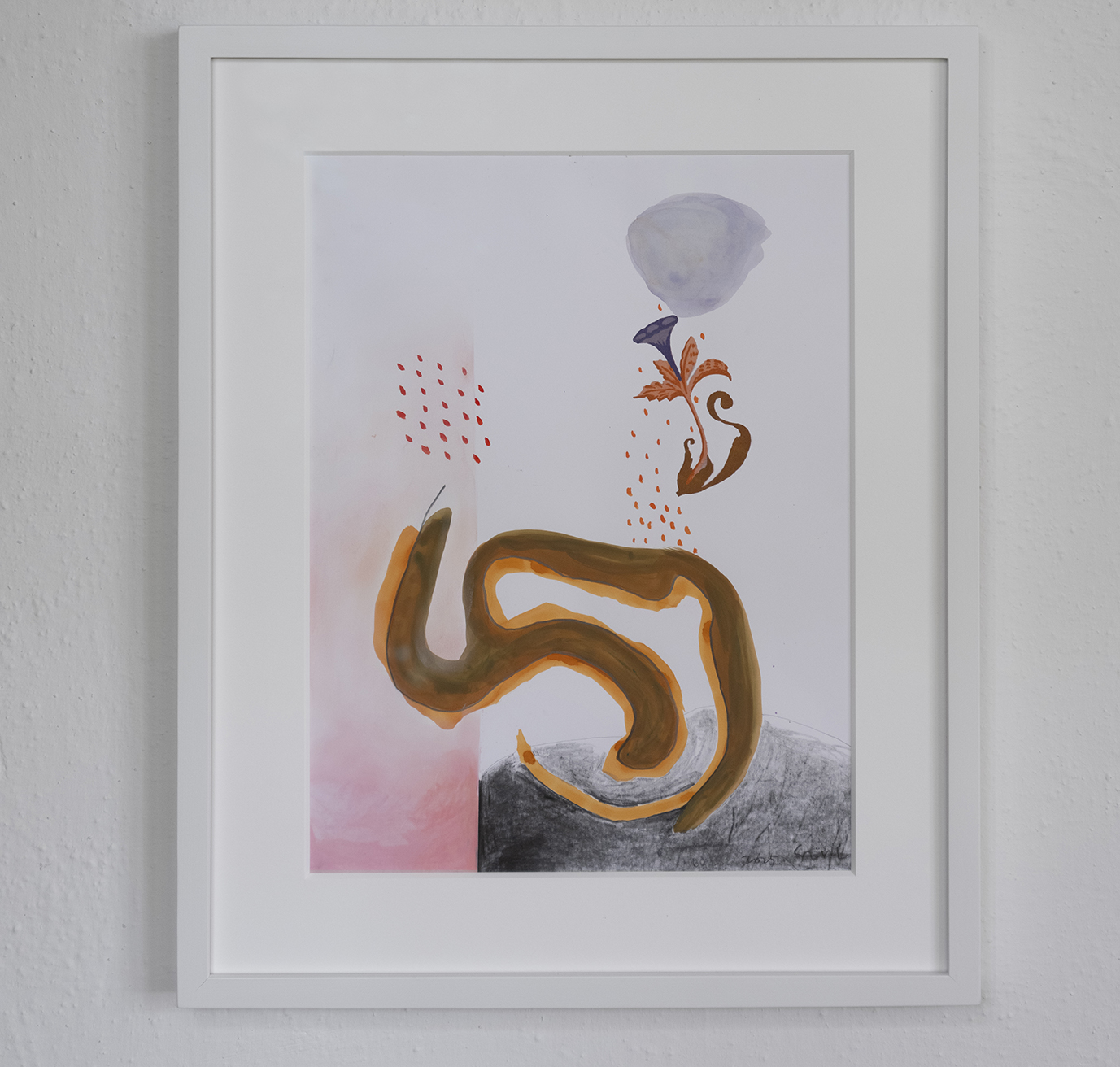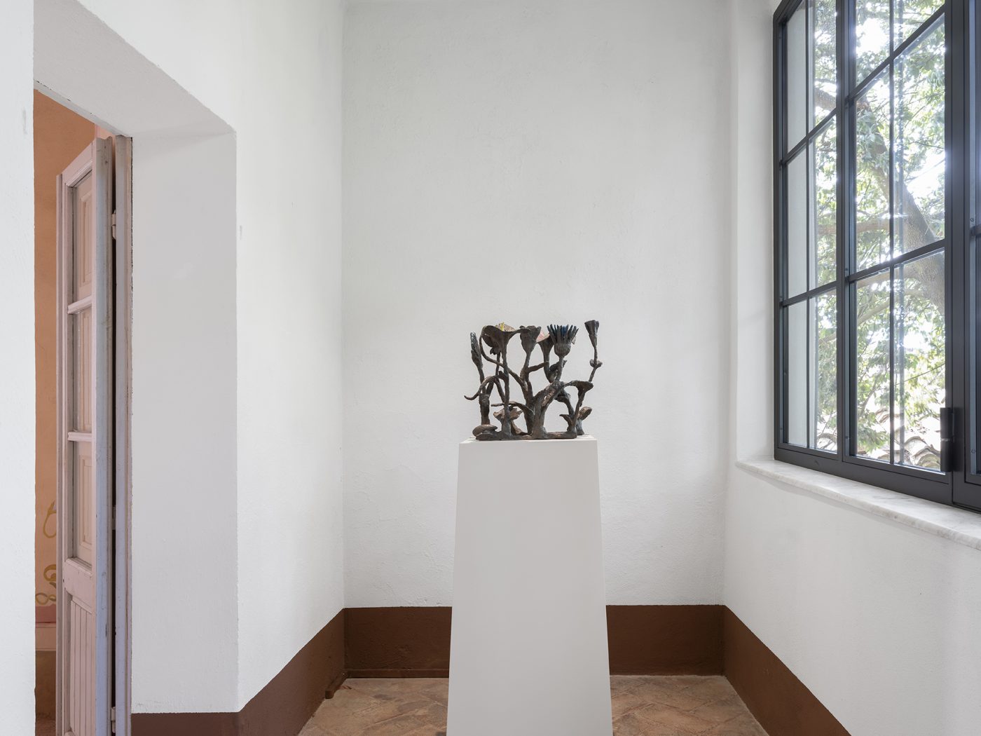 Nel video Pale Pink Universe, lo spettatore è guidato in un percorso visivo che si apre con un ambiente liquido e si trasforma via via in presenze floreali, fino all’apparizione di un acino. La colonna sonora, composta per l’occasione da Bojan Vuletić, lascia infine spazio alla voce dell’artista, che recita un poema del poeta medievale Dino Frescobaldi (1271–1316). L’installazione include anche la scultura in bronzo Bouquet Giocondo S 01 (2025), di ispirazione floreale, che richiama le decorazioni in stile Art Nouveau del castello, e il disegno Bouquet Giocondo D 01 (2025).